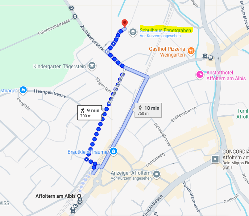Zu Fuss vom Bahnhof Affoltern a. A. ca. 9 Minuten gemäss nachfolgender Planvorlage.