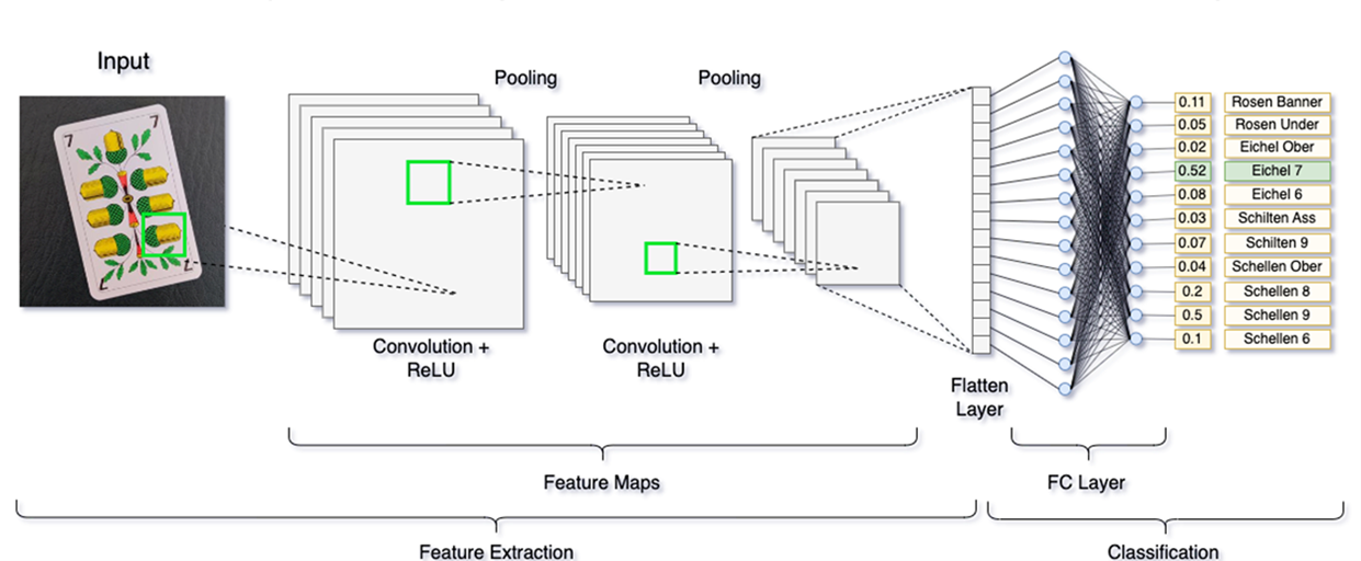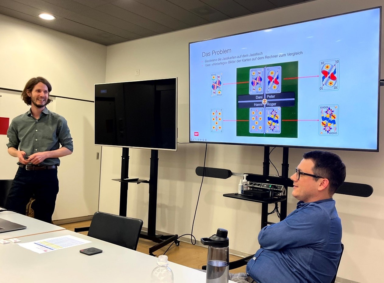 Sehr bald veranschaulichten die beiden die komplexen Herausforderungen punkto Technik und Trainingsplanung am Beispiel eines Rechners mit angeschlossener Kamera, der bei Jass-Sendungen zuverlässig zählen und den Spielstand überwachen soll. Aus Sicht eines Computers eine grosse Aufgabe... Der Lerneffekt dieser Demonstration auf dem Jass-Teppich war jedenfalls enorm.