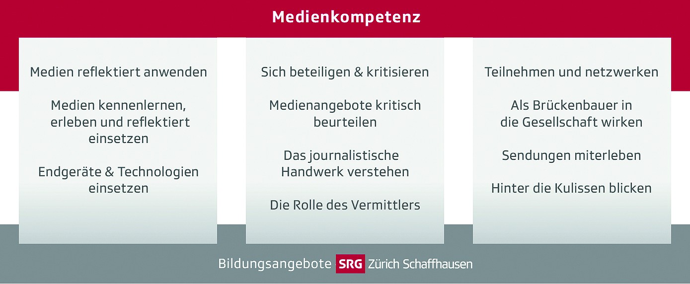 Das Ausbildungskonzept zielt auf die Befähigung der Teilnehmenden, Medien reflektiert anzuwenden, sich als zivilgesellschaftliche Akteure zu beteiligen, Medienangebote kritisch zu beurteilen und ihre Rolle als Vermittler zwischen der SRG, dem Unternehmen und der Gesellschaft wahrzunehmen. Das jährlich evaluierte Bildungsangebot wird innerhalb der drei Bereiche «Medien reflektiert anwenden», «sich beteiligen & kritisieren» und «teilnehmen & netzwerken» organisiert. Medienkompetenz ist dabei der Leitbegriff.